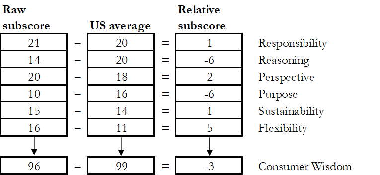 To compute your relative dimension subscores, simply subtract the US average from each raw subscore, which may result in a positive or negative number; this is your relative subscore for each dimension. Then, add up all of your dimension relative subscores (the column of scores) to get your overall Consumer Wisdom relative score. Here is what it looks like for the example score sheet above: