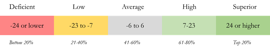 For our example set of scores, relative strengths include Perspective (a “high” score of 2) and Flexibility (a “superior” score of 5), and relative weaknesses include Reasoning and Purpose (both with “deficient” scores of -6).